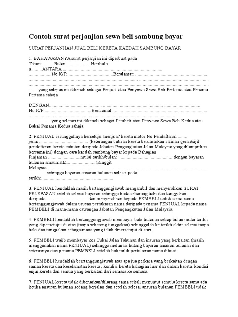 Surat Perjanjian Jual Beli Kereta Kaedah Sambung Bayar Pdf